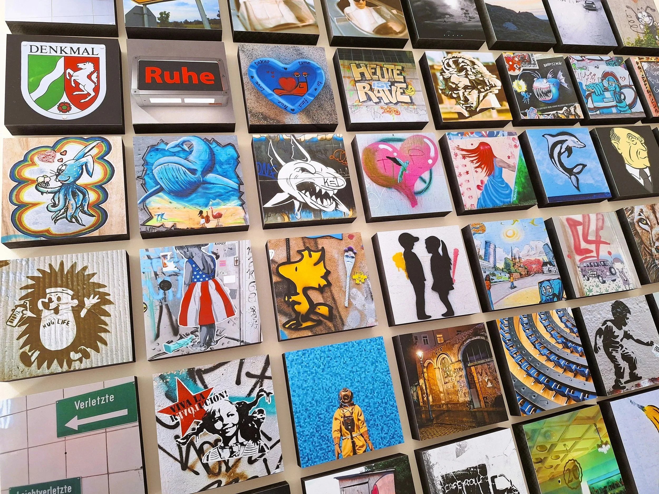 Fotos im Format 10 x 10 cm auf einer 1,9 cm starken, schwarz gefärbten MDF-Platte als Kontrast zu den intensiven Farben und unkonventionellen Formen der Street-Art-Motive.